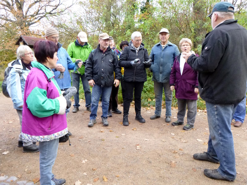 Im Namen der Auwaldstation und Anbetracht des Beginns der Karnevalszeit überreichte Ulrich Breitenstein, den Teilnehmern des Parkpflegeeinsatzes 2023, eine Freikarte zum Besuch der Informations- und Beobachtungsplattform mit einer Gültigkeit „natürlich vom 11.11. um 11 Uhr 11. bis Faschingsdienstag 2024“. Zudem bekamen die Wanderer, auf Wunsch, zur Erinnerung an diesen Tag, einen Stempel der Auwaldstation in ihr Wanderheft.