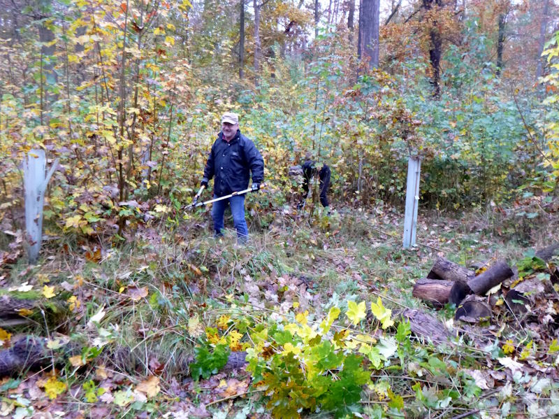 Zum diesjährigen Arbeitsprogramm gehörten die bekannten Arbeiten am Gehölz, Sichtachsen freistellen, Aufwuchs am Wegesrand zurückschneiden, Verschönerungsarbeiten und Unkraut in den Rabatten beseitigen. Alles was zu einer Parkpflege gehört. Etwas Besonderes war dieses Mal die Bergung bereits geschälter Eichenrinde für die Waldkapelle im Auwald.